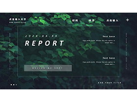 PPT模板封面,使用了清新丛林树叶背景图片。中间填写商务汇报PPT标题。界面风格绿色清新。