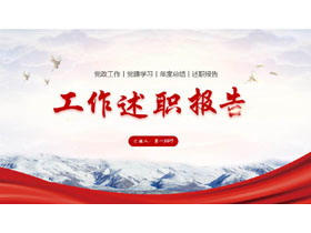 PPT模板封面,使用了红绸缎背景图片、群山背景图片。中间填写工作述职报告PPT标题,设计风格为大气党政风。