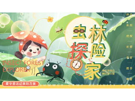 这是一套绿色清新插画风“虫林探险家”夏令营活动策划方案PPT模板,共17页;