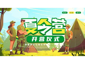 PPT模板封面,使用了卡通帐篷背景图片、卡通少年背景图片。中间填写夏令营开营仪式PPT标题,设计风格为清新插画风。