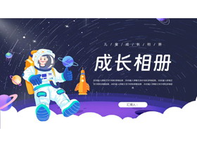 PPT模板封面,使用了卡通星空背景图片、卡通宇航员背景图片。右侧填写成长相册PPT标题,设计风格为精美卡通风格。