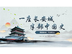 PPT模板封面,使用了古建筑背景图片、水墨群山背景图片。右侧填写“一座长安城半部中国史”PPT标题,设计风格为古典中国风。