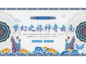 蓝色古典花纹背景的梦幻之旅神奇云南PPT模板