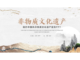 PPT模板封面,使用了鎏金曲线背景图片、群山背景图片。中间填写非物质文化遗产PPT标题,设计风格为简约中国风。