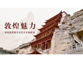 PPT模板封面,使用了敦煌古建筑背景图片。左侧填写“敦煌魅力”PPT标题,设计风格为精美古典。