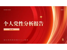 PPT模板封面,使用了红金曲线背景图片。左侧填写个人党性分析报告PPT标题,设计风格为精美党政风。