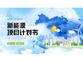 PPT模板封面,使用了卡通风车背景图片、卡通蓝天白云背景图片。左侧填写新能源项目计划书PPT标题,设计风格为精美卡通风格。