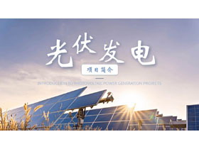 PPT模板封面,使用了太阳能板背景图片。中间填写光伏发电项目简介PPT标题,界面风格契合新能源主题。
