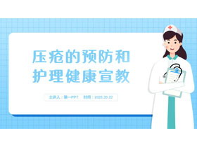这是一套蓝色卡通护士背景的压疮的预防和护理健康宣教PPT模板,共18页;