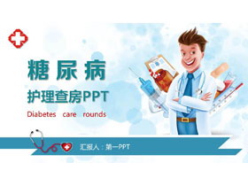 青色卡通医生背景的糖尿病护理查房知识讲座PPT模板