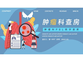 PPT模板封面,使用了矢量医生、人体器官剪切画背景图片。右侧填写肿瘤科查房PPT标题,设计风格为矢量剪切画风格。
