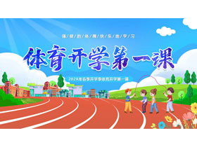 这是一套蓝色卡通跑道背景的体育开学第一课PPT模板,共25页;