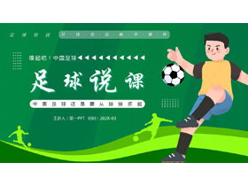 绿色卡通男孩背景的足球说课培训教育PPT模板