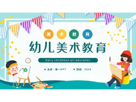 PPT模板封面,使用了画画的卡通女孩背景图片。中间填写幼儿美术教育PPT标题,设计风格为精美卡通风格。