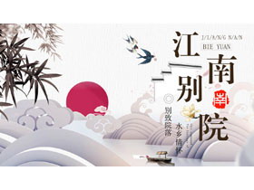 PPT模板封面,使用了波浪曲线背景图片、红日背景图片。右侧填写“江南别院”PPT标题,设计风格为精美中国风。