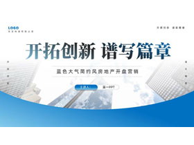 蓝色写字楼背景的“开拓创新谱写篇章”房地产开盘营销PPT模板