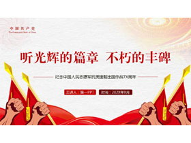 PPT模板封面,使用了红旗背景图片、紧握的拳头背景图片。中间填写“听光辉的篇章不朽的丰碑”PPT标题,设计风格为红色党政风。