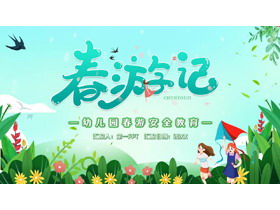 PPT模板封面,使用了放风筝的卡通女孩背景图片、卡通绿叶花草背景图片。中间填写“春游记”幼儿园春游安全教育PPT标题,设计风格为清新卡通风格。