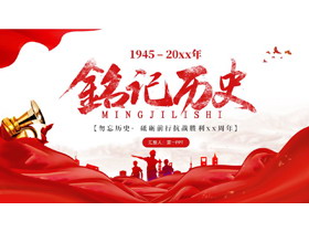 PPT模板封面使用了红色绸缎背景图片、军号背景图片、人物剪影背景图片、城市剪影背景图片。中间填写“铭记历史”PPT标题,设计风格为大气党政风。