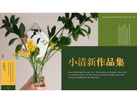 PPT模板封面,使用了插花艺术摄影背景图片。右侧填写小清新作品集PPT标题,设计风格为清新文艺风格。