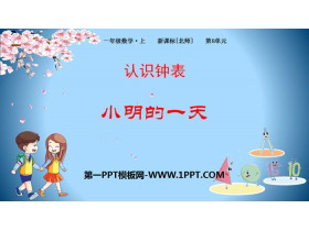 关键词:北师大版一年级上册数学PPT课件免费下载,小明的一天PPT下载,认识钟表PPT下载,.PPT格式;