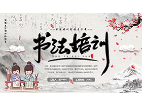 PPT模板封面,使用了水墨群山、梅花、写字的古代学童背景图片。中间使用毛笔字书写了书法培训PPT标题。界面风格古典雅致。
