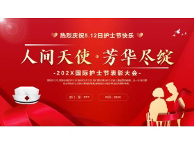 这是一套红色绸缎搭配护士剪影“人间天使芳华尽绽”国际护士节表彰大会PPT模板,共31页;