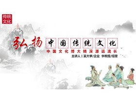 PPT模板封面,使用了水墨群山、古人讲学背景图片。中间填写弘扬中国传统文化PPT标题。界面元素契合传统文化主题。