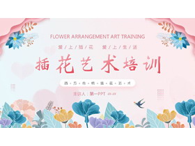 PPT模板封面,使用了多彩花卉背景图片。中间填写插花艺术培训PPT标题。界面风格精美时尚。