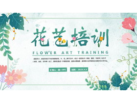 PPT模板封面,使用了多彩花卉背景、绿叶背景图片。中间填写花艺培训PPT标题。界面风格精美时尚。