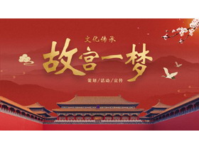 PPT模板封面,使用了宫殿图片、水墨山水背景图片、梅花背景图片、仙鹤背景图片。中间填写“故宫一梦”PPT标题。界面风格古典大气。