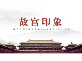 PPT模板封面,使用了故宫宫殿图片、水墨山水背景。上方填写“故宫印象”PPT标题。界面风格古典大气。