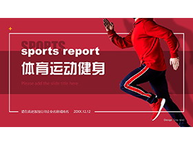 PPT模板封面,使用了红色底色,和奔跑的健身人物背景图片。左侧填写体育运动健身PPT标题。界面背景与体育运动主题搭配。