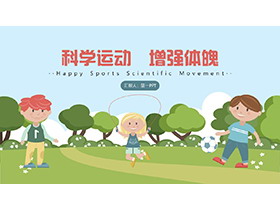 PPT模板封面,使用了在清新森林里跳绳的小朋友背景图片。中间填写“科学运动增强体魄”体育健身知识PPT标题。界面风格简约清新。