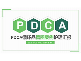 PPT模板封面,使用了绿色六边形背景。中间填写PDCA循环品管圈案例护理汇报PPT标题。界面风格简洁实用。