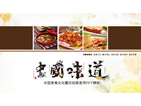 PPT模板封面,使用了美味菜品背景图片。中间填写“中国味道”中国美食文化介绍PPT标题。界面背景与美食主题搭配。