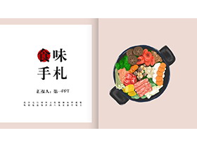 PPT模板封面,使用了香锅食材背景图片。左侧填写“食味手札”主题PPT标题。界面为折页画册风格。