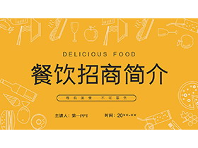 PPT模板封面,使用了黄色底色,手绘美食图标背景图片。中间填写餐饮招商简介PPT标题。界面背景与餐饮主题搭配。