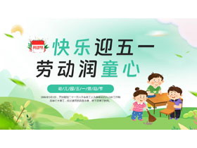 PPT模板封面,使用了卡通小朋友背景图片、卡通草坪群山背景图片。中间填写“快乐迎五一劳动润童心”PPT标题,设计风格为清新卡通风格。