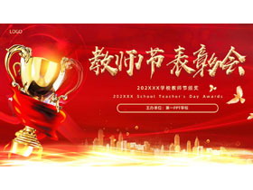 PPT模板封面,使用了红色背景,搭配金色奖杯背景图片、城市剪影背景图片。左侧填写教师节表彰大会PPT标题,设计风格红金大气。