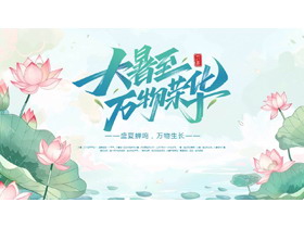 PPT模板封面,使用了荷花、荷叶背景图片。中间填写“大暑至万物荣华”PPT标题,设计风格为清新水彩风。