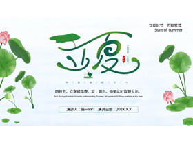 PPT模板封面,使用了荷花荷叶背景图片。中间填写立夏PPT标题,设计风格为古典中国风。