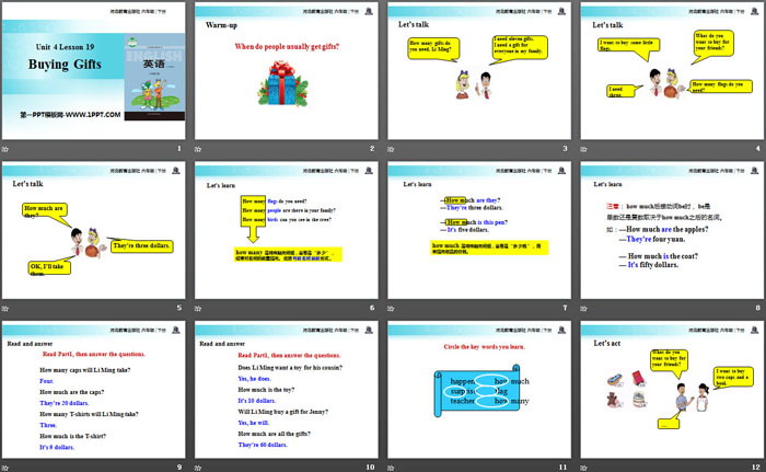 关键词:冀教版六年级下册英语PPT课件免费下载,Buying GiftsPPT下载,Li Ming Comes HomePPT下载,.PPT格式;