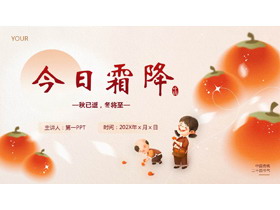 PPT模板封面,使用了插画风红柿子背景图片、卡通儿童背景图片。左侧填写今日霜降PPT标题,设计风格为精美插画风。