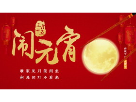 PPT模板封面,圆月背景图片、筷子背景图片、红灯笼背景图片。左侧填写“正月十五闹元宵”PPT标题,设计风格为喜庆大气。
