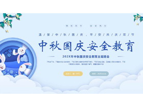 PPT模板封面,使用了卡通白兔背景图片、卡通白云背景图片。右侧填写中秋国庆安全教育PPT标题,设计风格为可爱卡通风格。