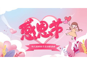 PPT模板封面,使用了卡通女孩背景图片、卡通花草背景图片、爱心背景图片。中间填写感恩节PPT标题,设计风格为可爱卡通风格。