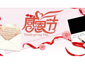 PPT模板封面,使用了贺卡背景图片、红丝带背景图片。中间填写感恩节PPT标题,设计风格为精美喜庆。