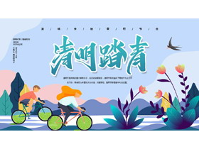 PPT模板封面,使用了骑行的人物剪切画背景图片、矢量花草剪切画背景图片。中间填写“清明踏青”PPT标题,设计风格为矢量剪切画风格。