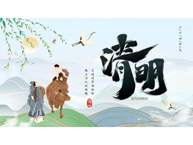 PPT模板封面,使用了国潮风牧童背景图片、国潮群山背景图片。右侧填写清明PPT标题,设计风格为精美国潮风。
